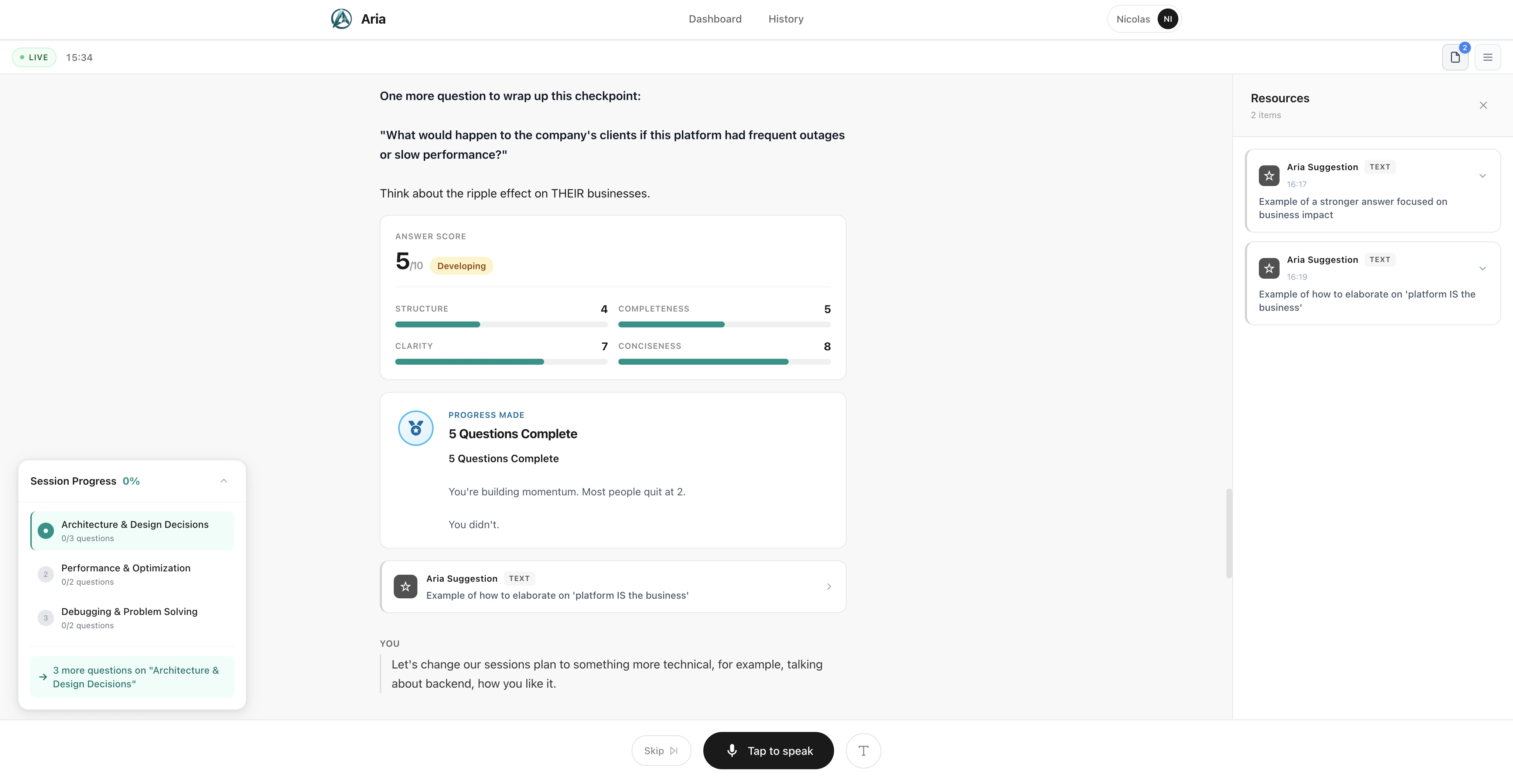Each session is 5–30 minutes. Aria leads the conversation, but you can steer it — ask for harder questions, switch topics, or dive deeper on something you're struggling with.